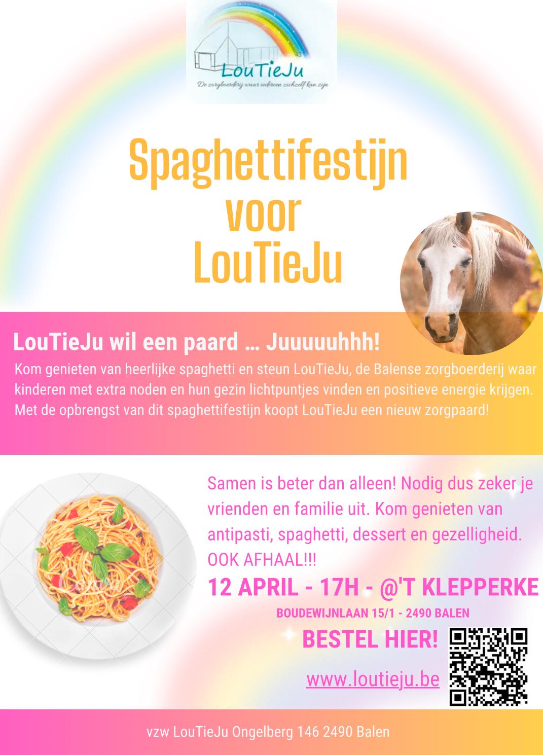 Kom genieten van heerlijke spaghetti en steun LouTieJu, de Balense zorgboerderij waar kinderen met extra noden en hun gezin lichtpuntjes vinden en positieve energie opdoen.